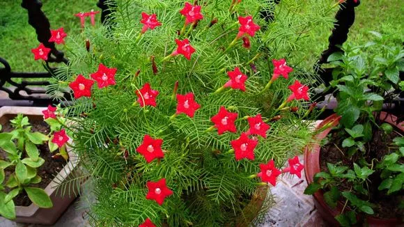 茑萝松极富攀援性,花叶俱美,盆栽时可用金属丝扎成各种屏风式、塔式。